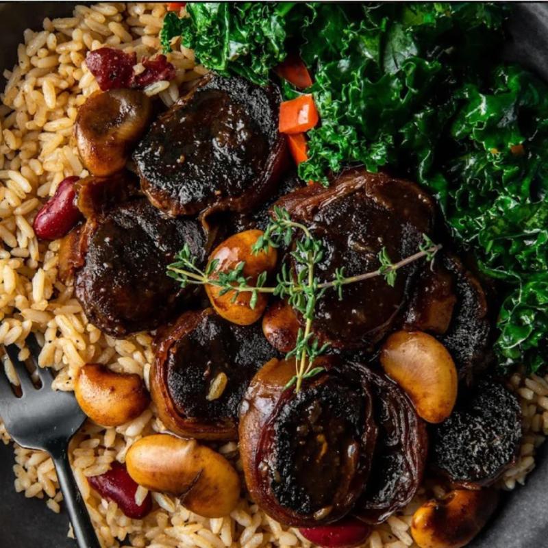 Our world famous soy free and plant based vegan oxtail with your choice of rice and 2 sides.